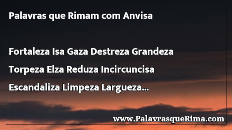 Rima para Anvisa, 129 rimas encontradas, a rima é uma repetição de sons a partir da vogal da última sílaba tônica do verso: veja todas palavras que podem rimar com Anvisa