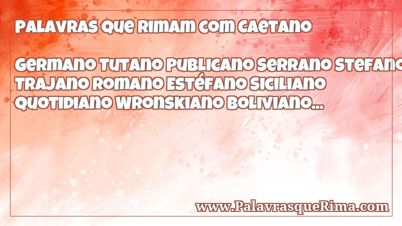 Rima para Caetano, 100 rimas encontradas, a rima é uma repetição de sons a partir da vogal da última sílaba tônica do verso: veja todas palavras que podem rimar com Caetano