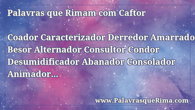 Rima para Caftor, 200 rimas encontradas, a rima é uma repetição de sons a partir da vogal da última sílaba tônica do verso: veja todas palavras que podem rimar com Caftor