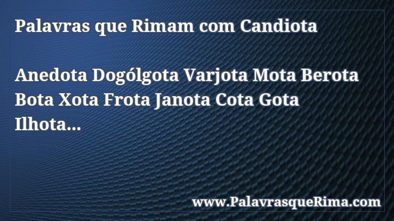Rima para Candiota, 34 rimas encontradas, a rima é uma repetição de sons a partir da vogal da última sílaba tônica do verso: veja todas palavras que podem rimar com Candiota