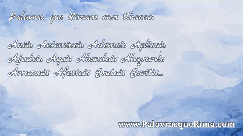 Rima para Chacais, 200 rimas encontradas, a rima é uma repetição de sons a partir da vogal da última sílaba tônica do verso: veja todas palavras que podem rimar com Chacais