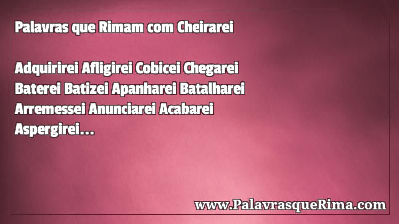 Rima para Cheirarei, 200 rimas encontradas, a rima é uma repetição de sons a partir da vogal da última sílaba tônica do verso: veja todas palavras que podem rimar com Cheirarei