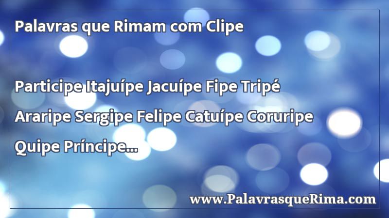 Rima para Clipe, 24 rimas encontradas, a rima é uma repetição de sons a partir da vogal da última sílaba tônica do verso: veja todas palavras que podem rimar com Clipe