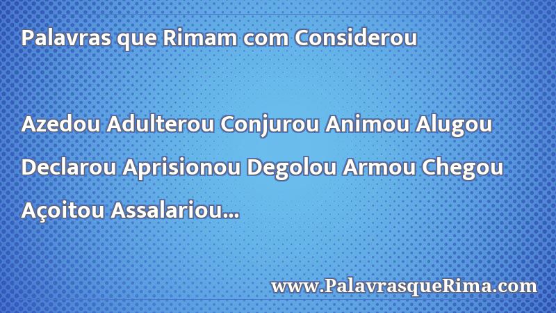 Rima para Considerou, 200 rimas encontradas, a rima é uma repetição de sons a partir da vogal da última sílaba tônica do verso: veja todas palavras que podem rimar com Considerou