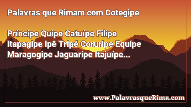 Rima para Cotegipe, 24 rimas encontradas, a rima é uma repetição de sons a partir da vogal da última sílaba tônica do verso: veja todas palavras que podem rimar com Cotegipe