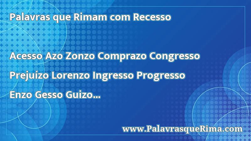 Rima para Recesso, 38 rimas encontradas, a rima é uma repetição de sons a partir da vogal da última sílaba tônica do verso: veja todas palavras que podem rimar com Recesso
