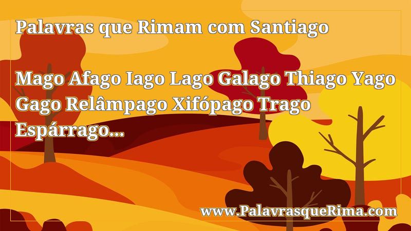 Rima para Santiago, 21 rimas encontradas, a rima é uma repetição de sons a partir da vogal da última sílaba tônica do verso: veja todas palavras que podem rimar com Santiago